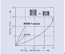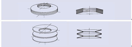 可以通過(guò)將由不同片數(shù)碟型彈簧組成疊合組合彈簧或不同厚度的單片碟型彈簧組合成碟型彈簧組來(lái)獲得遞增的載荷特性曲線,在這種情況下,彈簧組達(dá)到壓平位置或極限行程后,單片彈簧或組合彈簧將不再對(duì)彈簧的變形量產(chǎn)生影響。